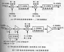 噪声总线伴随着信号同时出现,尽可能提高噪声背景下输出端的信噪比是改善接收机灵敏度的重要措施。GPS接收机天线单元接收并提供给射频单元的信号频率很高而信道带宽又很窄,要直接滤出所需信道,则需Q值非常大的滤波器,至少目前的技术水平难以满足这一指标;另外高频电路在增益、精度和稳定性等方面的问题,在高频范围直接对GPS卫星信号进行解调很不现实。为此,在射频单元设计中采用“超外差”式多级变频配合区配滤波器的电路结构,以消除噪声干扰,解决高频信号处理中所遇到的困难。适合这种电路结构的芯片采用了第二代GPS接收机射频前端GP2010。它采用44引脚、帧面方形封装,主要集成了频率合成器、混频器、自动增益控制(AGC)电路以及数字量化器等。GP2010接收的信号频率与L1载波的卫星信号频率兼容,主要用于设计C/A码GPS接收机的射频单元。微弱的GPS高频信号通过超外差式三级混频电路,去掉了其它信道干扰,获得了足够增益,解调并撮出所需的中频信息。图5给出了前两级超外差式下变频器和带有自动增益控制(AGC)电路的第三级混频器的工作原理图,每经过一次下变频,输出信号的频率降低、幅度增大,而其它信道和频段的干扰则被逐步滤除。